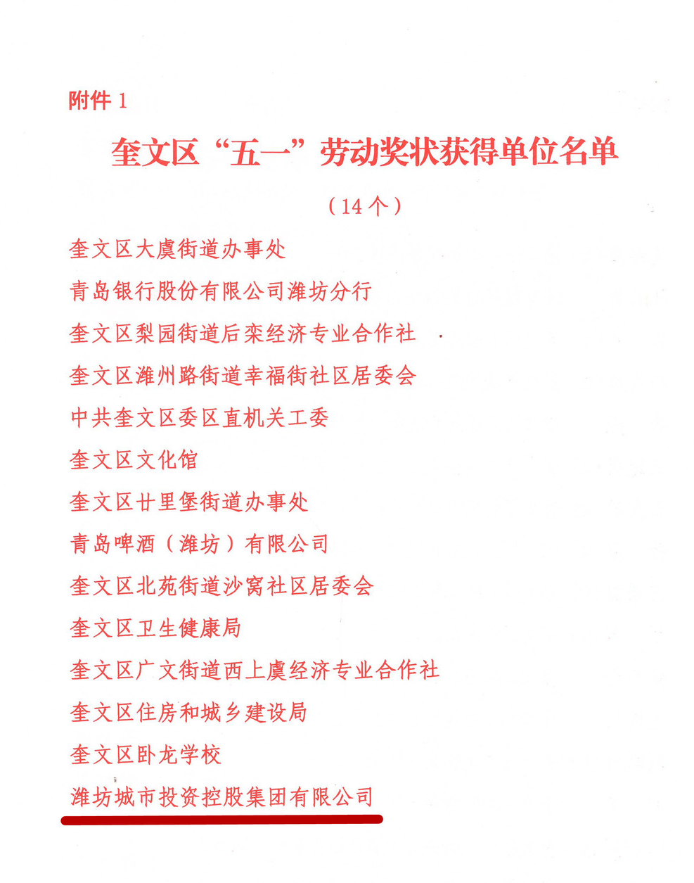 “五一”國際勞動節(jié)到來之際,4月30日上午,濰坊市奎文區(qū)總工會召開奎文區(qū)慶?!拔逡弧眹H勞動節(jié)大會。會上,集中表彰和表揚(yáng)了全區(qū)先進(jìn)集體和個人,城投集團(tuán)榮獲“奎文區(qū)五一勞動獎狀”。