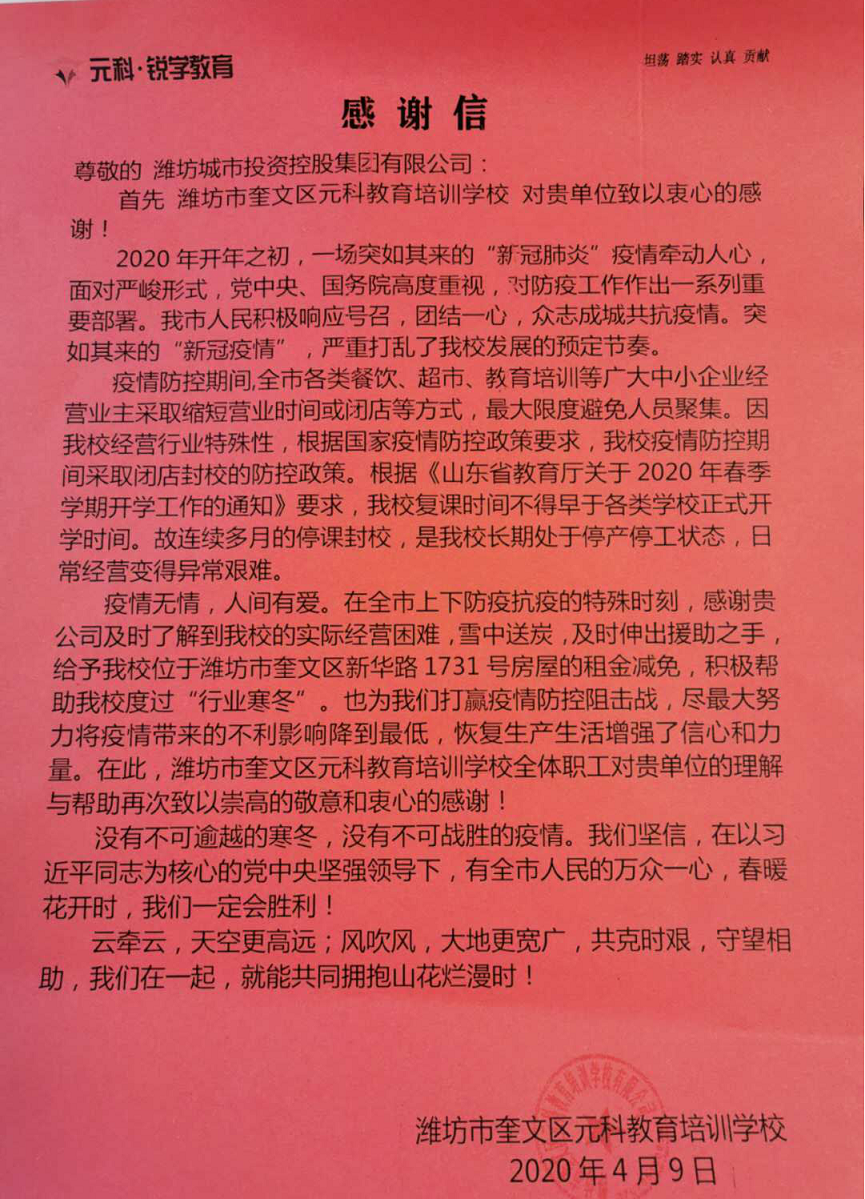 疫情當前,這樣的暖心行為讓入駐企業(yè)感動。日前,元科教育培訓學校負責人專程給城投集團送來感謝信,“……連續(xù)多月的停課封校使我校長期處于停產(chǎn)停工狀態(tài),日常經(jīng)營變得異常艱難。在全市上下防疫抗疫的特殊時刻,感謝貴公司及時了解到我校的實際經(jīng)營困難,雪中送炭,及時伸出援助之手,給予我校位于濰坊市奎文區(qū)新華路1731號房屋的租金減免,積極幫助我校度過行業(yè)寒冬……”鴻途文化傳播有限公司也給靈獅文化公司送來“疫情無情,人間有愛,扶持企業(yè),無私援助”的錦旗,對公司響應(yīng)政府號召,主動減免租金,助推企業(yè)復工復產(chǎn)的舉動表示感謝。