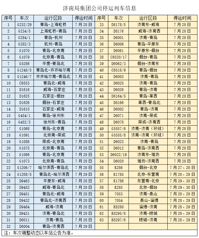 從中國鐵路濟(jì)南局集團(tuán)有限公司(以下稱國鐵濟(jì)南局)獲悉,為應(yīng)對(duì)第6號(hào)臺(tái)風(fēng)“煙花”,國鐵濟(jì)南局從7月27日20點(diǎn)起,啟動(dòng)應(yīng)急響應(yīng),同時(shí)密切關(guān)注氣象部門預(yù)報(bào)臺(tái)風(fēng)運(yùn)行徑路和影響范圍,適時(shí)采取停運(yùn)、限速、迂回、折返、加開、恢復(fù)開行等措施,動(dòng)態(tài)調(diào)整列車開行方案,確保旅客安全出行。為最大限度減少臺(tái)風(fēng)對(duì)旅客運(yùn)輸組織的影響,確保旅客列車運(yùn)行安全,7月28日至30日,國鐵濟(jì)南局安排膠濟(jì)客專、青榮城際、青鹽鐵路、濟(jì)青高鐵等線路部分旅客列車停運(yùn),停運(yùn)列車信息(詳見附表)。在運(yùn)輸組織上,鐵路部門還將根據(jù)臺(tái)風(fēng)和降雨情況,對(duì)管內(nèi)其他線路采取列車?yán)@行、迂回、停運(yùn)等措施,對(duì)前期降雨量較大的德大、東萊、瓦日及京九鐵路和其他支線鐵路根據(jù)情況提前采取限速和封鎖措施,確保鐵路運(yùn)輸安全。根據(jù)氣象預(yù)測(cè),此次臺(tái)風(fēng)“煙花”強(qiáng)度大、降雨量大,將給山東省內(nèi)鐵路正常運(yùn)營帶來嚴(yán)重影響,國鐵濟(jì)南局堅(jiān)持人民至上、生命至上,始終把確保人民生命安全放在第一位,提前部署防范措施,密切跟蹤臺(tái)風(fēng)動(dòng)態(tài),加強(qiáng)臺(tái)風(fēng)及汛期行車調(diào)度指揮,嚴(yán)格落實(shí)鐵路汛期行車安全措施。組織鐵路沿線干部職工堅(jiān)守崗位,時(shí)刻保持高度警惕,做好防洪巡查和應(yīng)急搶修準(zhǔn)備。提前組織鐵路線路外部環(huán)境、站房、設(shè)備設(shè)施風(fēng)險(xiǎn)隱患排查整治,嚴(yán)格落實(shí)防洪防汛各項(xiàng)措施,確保旅客生命財(cái)產(chǎn)安全。鐵路部門提醒旅客,動(dòng)態(tài)調(diào)整列車開行等相關(guān)信息,請(qǐng)以車站公告為準(zhǔn),旅客還可關(guān)注鐵路12306客服網(wǎng)站或鐵路12306手機(jī)客戶端,以便合理安排行程。已購買停運(yùn)列車車票的旅客,可于票面乘車日期起30日內(nèi)(含當(dāng)日)在互聯(lián)網(wǎng)辦理退票,或持購票時(shí)所使用的有效身份證件原件到車站專窗退票(已打印報(bào)銷憑證的請(qǐng)將憑證交予車站窗口工作人員),以上均不收取手續(xù)費(fèi)。