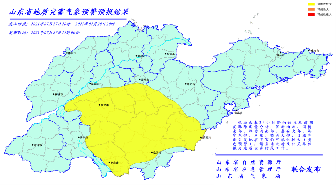 7月27日,記者從山東氣象局了解到,根據(jù)臺(tái)風(fēng)“煙花”最新預(yù)報(bào)和未來24小時(shí)降雨預(yù)報(bào)及前期實(shí)際降雨量分析,山東省自然資源廳、山東省應(yīng)急管理廳、山東省氣象局7月27日17時(shí)聯(lián)合發(fā)布地質(zhì)災(zāi)害氣象風(fēng)險(xiǎn)預(yù)警,濟(jì)南南部、淄博南部、濰坊西南部、泰安大部、濟(jì)寧東部、棗莊、臨沂大部、日照降雨引發(fā)地質(zhì)災(zāi)害的可能性較大(黃色預(yù)警),請(qǐng)當(dāng)?shù)卣跋嚓P(guān)單位做好地質(zhì)災(zāi)害防范工作。山東省水利廳、省氣象局聯(lián)合發(fā)布山洪災(zāi)害氣象預(yù)警27日18時(shí),山東省水利廳、省氣象局聯(lián)合發(fā)布山東省山洪災(zāi)害氣象預(yù)警。預(yù)計(jì)7月27日20時(shí)至7月28日20時(shí),泰安、濟(jì)寧、臨沂市局部地區(qū)發(fā)生山洪災(zāi)害的可能性大(橙色預(yù)警),濟(jì)寧市局部地區(qū)發(fā)生山洪災(zāi)害的可能性較大(黃色預(yù)警),泰安、臨沂、濟(jì)寧、棗莊、日照、濟(jì)南等市局部地區(qū)可能發(fā)生山洪災(zāi)害(藍(lán)色預(yù)警)。橙色預(yù)警區(qū)域包括:新泰市東部及南部、寧陽縣東南部、泗水縣北部、蒙陰縣西北部、平邑縣北部。藍(lán)色預(yù)警區(qū)域包括:泰山區(qū)大部、岱岳區(qū)大部、肥城市大部、新泰市大部、寧陽縣東部、平邑縣大部、蒙陰縣南部、費(fèi)縣大部、蘭陵縣北部、沂南縣西南部、莒南縣東部、臨沭縣東北部、泗水縣大部、鄒城市東部、曲阜市北部及東南部、山亭區(qū)大部、莒縣東南部、嵐山區(qū)西北部、東港區(qū)西南部、萊蕪區(qū)東部及南部、章丘區(qū)南部、鋼城區(qū)南部、長清區(qū)南部、歷城區(qū)南部、平陰縣東北部。其他地區(qū)也可能因局地短歷時(shí)強(qiáng)降水引發(fā)山洪災(zāi)害,請(qǐng)各地注意做好實(shí)時(shí)監(jiān)測(cè)、防汛預(yù)警和轉(zhuǎn)移避險(xiǎn)等防范工作。山東省水利廳啟動(dòng)水旱災(zāi)害防御Ⅳ級(jí)應(yīng)急響應(yīng)