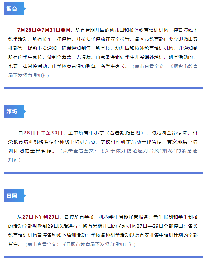 山東省教育廳今天發(fā)布緊急通知,各地各學(xué)校要緊密結(jié)合學(xué)校實(shí)際,針對(duì)臺(tái)風(fēng)防御組織力量做好學(xué)校安全隱患排查工作,發(fā)現(xiàn)安全隱患要立即整治,確保校園安全和師生平安。7月30日之前,中小學(xué)幼兒園暫停所有校(園)內(nèi)托管服務(wù)和暑假開園托幼機(jī)構(gòu)教學(xué)活動(dòng);各地各學(xué)校要加強(qiáng)家校溝通,通過各種方式告知家長在臺(tái)風(fēng)預(yù)警期內(nèi)暫停外出參加各類培訓(xùn);有關(guān)高校要切實(shí)做好假期留校學(xué)生惡劣天氣及自然災(zāi)害的風(fēng)險(xiǎn)防范工作,堅(jiān)決不能出現(xiàn)因防范工作不到位而發(fā)生學(xué)生非正常傷亡事件。山東16市發(fā)布緊急通知暫停一切教學(xué)活動(dòng)